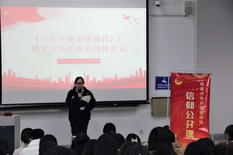 本次信仰公开课分为“筑牢民族共同体意识”“释放民族多样化活力”“谱写民族团结主旋律”三个篇章,由英语师范202班谭杨璐主持。在第一篇章里,同学们就《习近平谈治国理政》(第三卷)英文版中有关民族共同体意识内容进行了学习分享。在第二篇章里,英语师范201班沈馨、英语师范201班沈芯茹分别讲述了长征路上“彝海结盟”的民族故事以及六盘山下的民族团结印记,以此加强大学生的民族认同感,铸牢大学生的中华民族共同体意识。第三篇章里,好色视频 少数民族学生代表日语202班吕皓佳、英语师范201班保鑫婕分别从民族历史、民族建筑、民族节日、饮食文化等方面介绍了蒙古族以及回族民族风情,使现场的同学们更深刻地了解我国的少数民族。随后,好色视频 党委副书记、副院长陈俊怀带领大家一同学习了党的十九届六中全会公报,要求大家学深悟透会议精神,从党的百年奋斗重大成就和历史经验中汲取奋进力量。信仰公开课在大合唱《爱我中华》中落下了帷幕。
