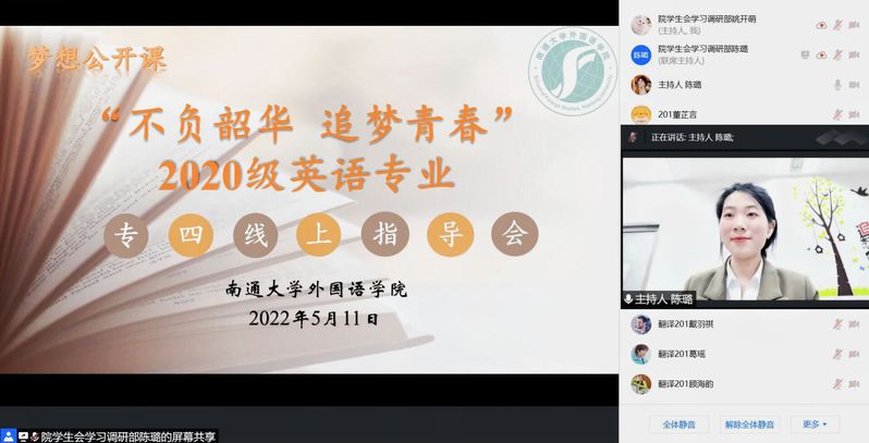 5月11日下午,好色视频 举办了“不负韶华 追梦青春”2020级专四考试线上指导会,年级辅导员、班主任及全体2020级本科生参与了本次活动。