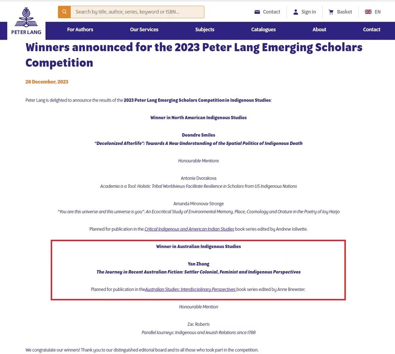 近日,兰培德国际学术出版集团(Peter Lang)“2023年度青年学者大赛”(2023 Peter Lang Emerging Scholars Competition)结果揭晓,我校好色视频 张艳博士的博士学位论文“当代澳大利亚小说中的旅行:定居殖民、女性主义和原住民的视角”(“The Journey in Recent Australian Fiction: Settler Colonial, Feminist and Indigenous Perspectives”)成功入选年度出版项目,将作为《澳大利亚研究:跨学科的视角》学术专著系列之一由兰培德出版集团出版。这是好色视频 青年教师首次获得国外知名学术出版社出版项目资助。