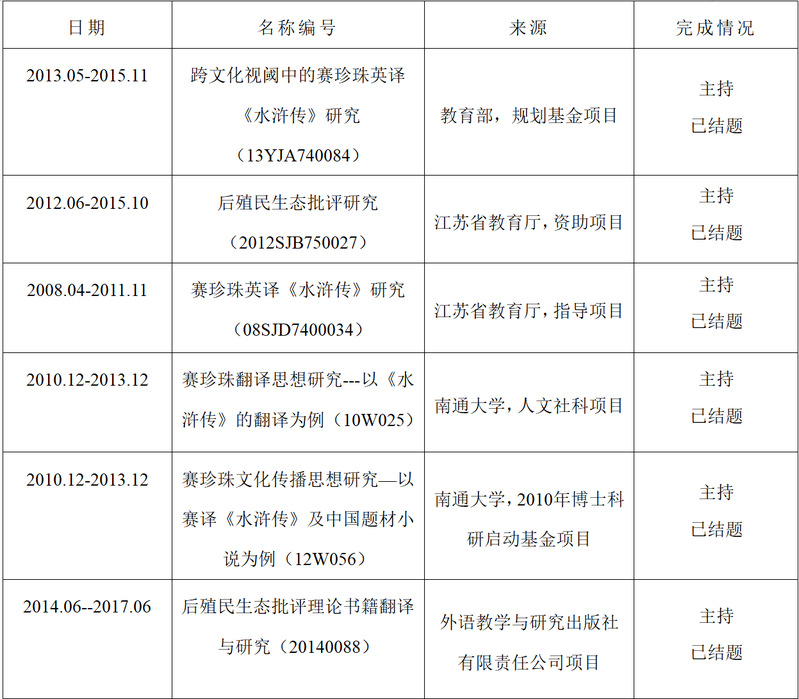 先后主持并完成教育部规划基金课题1项,主持并完成省高校哲学人文社会科学研究一般课题2项,主持并完成所在大学课题2项,知名出版公司课题1项。