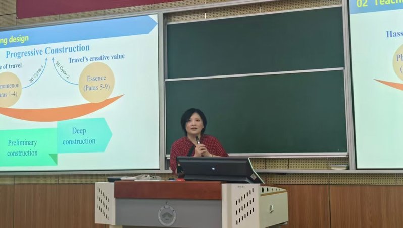 院长佘军出席活动并致辞。他对公共外语团队的获奖表示衷心祝贺,并充分肯定他们在教学理念、课堂设计与课程思政融入方面的积极探索。他强调,教学工作是高校教师的生命线,是教师立身之本,要始终以课堂质量为首要任务,同时要进一步推进教学过程化建设,强化全程设计、过程跟踪与成效反馈,确保学生“每堂课有思考、每次学有所获”。随后,倪红艳和武颖老师以“Breaking Stereotypes through Travel(踏万里之途,破认知禁锢)”为主题,进行深入的教学分享和示范授课。两位老师在授课过程中,巧妙融入思政元素,充分借助数智技术,通过旅行主题引导学生打破刻板印象,增强文化自信,厚植家国情怀,培养全球视野,获得在场教师一致好评。